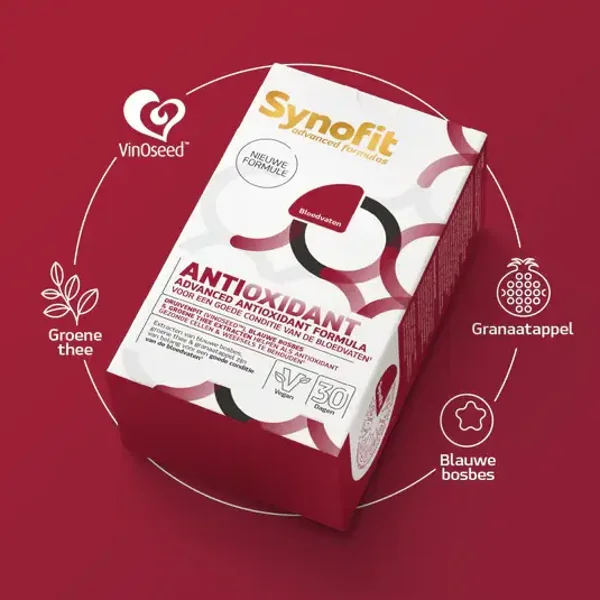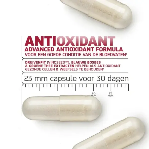 Advanced Antioxidant Formula is een zorgvuldig samengestelde formule met vier kruidenextracten voor een goede conditie van de bloedvaten.1 Verzorgende invloed op de bloedvaten Extracten van blauwe bosbes, groene thee en granaatappel zijn van belang voor soepele en elastische aderen. Ze hebben een verzorgende invloed op de bloedvaten.1 Antioxidanten Druivenpit (VinOseed™)2 , groene thee en blauwe bosbes extracten helpen als antioxidant gezonde cellen en weefsels te behouden.1