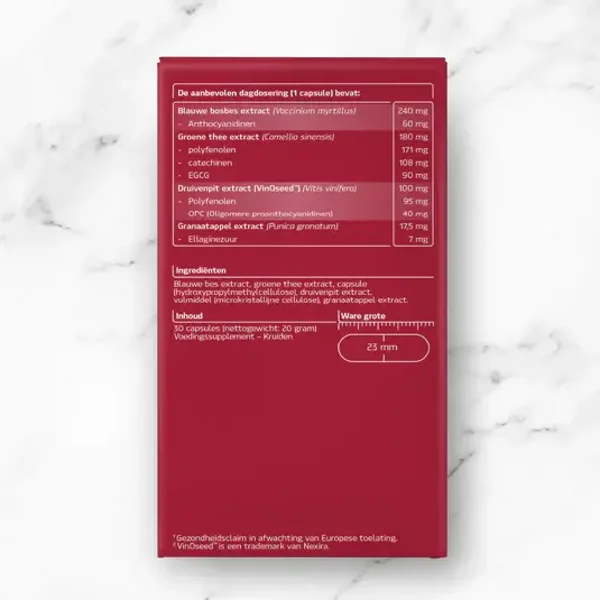 Blauwe bes extract, groene thee extract, capsule (hydroxypropylmethylcellulose), druivenpit extract,